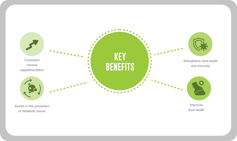 Accurate and consistent mineral uptake, Removes the need to dust pasture, Improved overall herd health and performance.